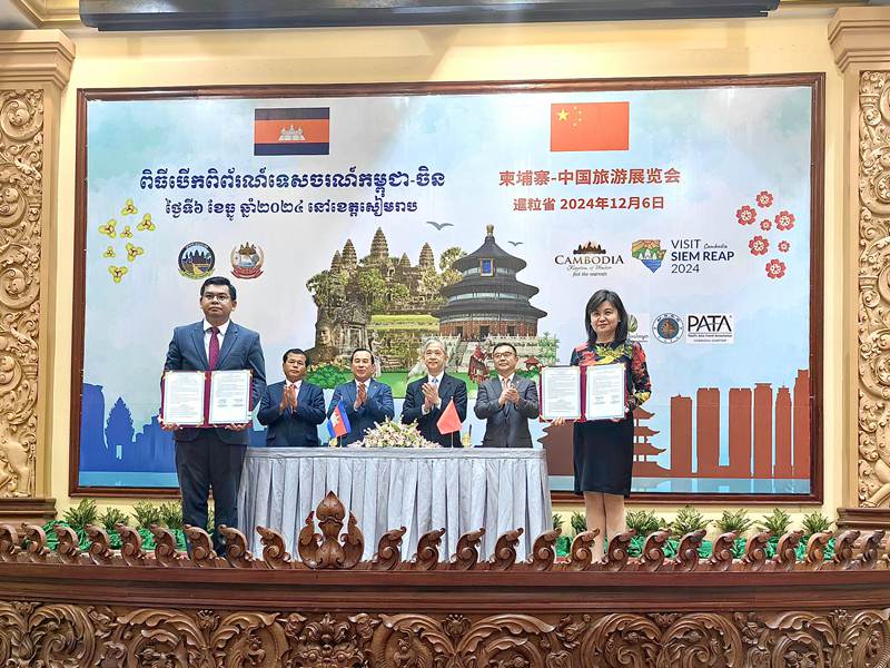 为深入贯彻落实习近平总书记提出的“同柬方携手打造高质量、高水平、高标准的新时代中柬命运共同体”重要讲话精神,助力中柬人文交流和旅游合作,在近期集团董事长王海民与中国驻柬埔寨大使汪文斌视频会谈后,12月6日,在柬埔寨暹粒开幕的中柬旅游展览会期间,集团与柬埔寨旅游部签署了旅游合作备忘录。在中国驻柬埔寨大使汪文斌、柬埔寨旅游大臣胡海、暹粒省副省长欧兴加、集团副总经理简易的见证下,开云kaiyun官网入口董事长郑丽娟和柬埔寨旅游部代表签署合作备忘录。