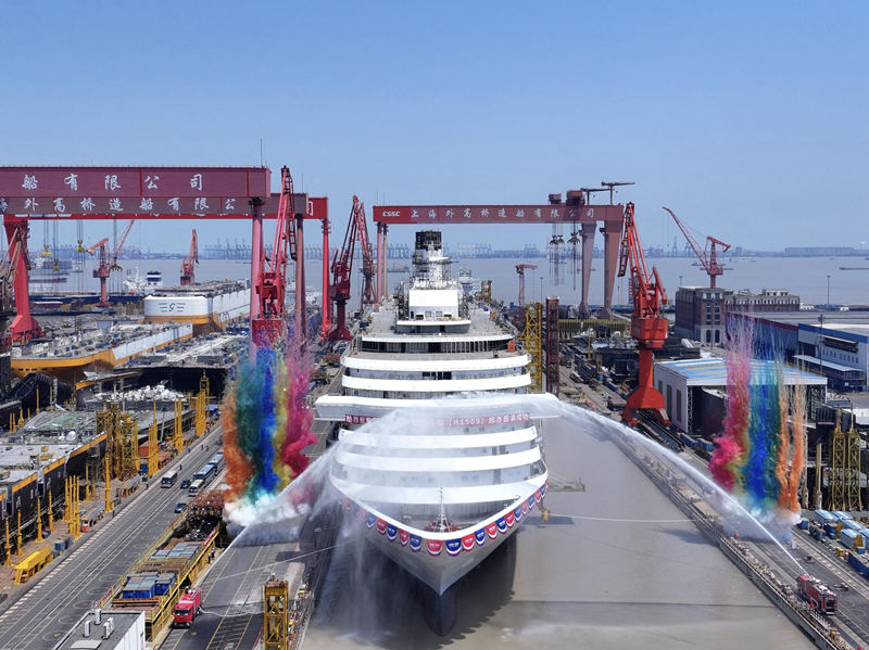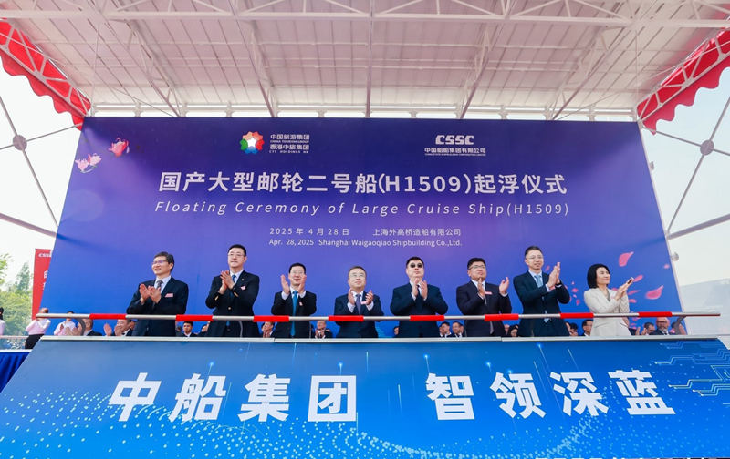 4月28日,第二艘国产大型邮轮“爱达·花城号”在上海外高桥造船有限公司顺利实现坞内起浮。工信部装备工业二司司长徐春荣、文旅部产业发展司副司长马力,中国船舶集团总经理王国强、副总经理胡贤甫,集团总经理范云军、董事兼华夏国际邮轮董事长石善博,上海市经济和信息化委员会副主任蒲亚鹏、浦东新区副区长李慧等出席仪式。