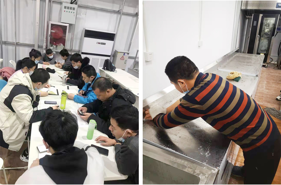由于运动员餐厅对菜单要求非常高,我们几个骨干就经常以会代训进行菜单培训,讨论需要的原材料,斟酌每道菜做法,测试菜品品质,查漏补缺、确定各种标准……目的只有一个:让参加冬奥会的运动健儿们享用新鲜、美味、可口又安全的“中国菜”。经过一段时间的菜单培训,餐厅和厨房终于可以开始布置了。原本清洁卫生工作是分配给实习生的,但这时候厨房实习生还未进村,我们厨房骨干和餐厅骨干共同承担了卫生清洁任务,没有抱怨,没有偷懒,每天都保证厨房、餐厅是干净卫生、合格标准的。这也给后来进村的实习生打了样,他们现在打扫起卫生来也是有模有样,越来越标准了。