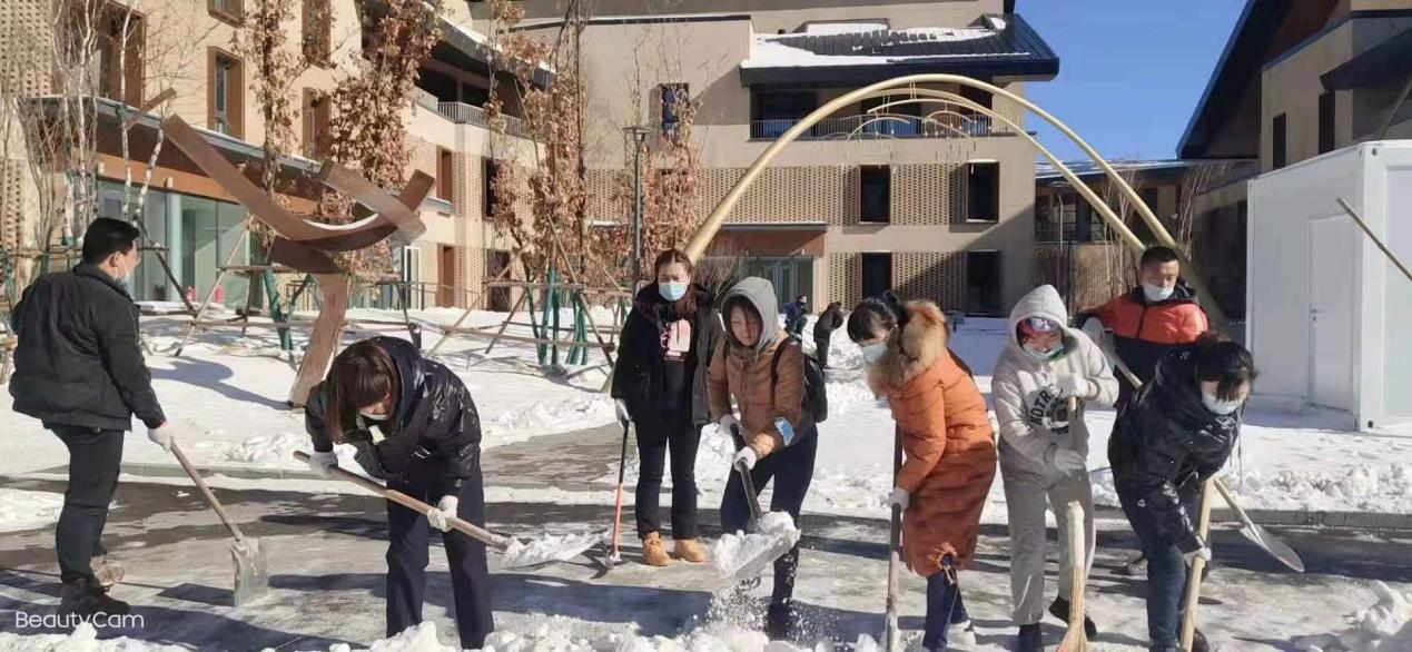 随着冬季来临,天气越来越冷了,我迎来了进村以后的第一场雪。那天清早,看着院内地上厚厚的积雪,我脑海中出现了一句俗语:瑞雪兆丰年,我想这肯定预示着我们的冬奥支援工作一定会圆满成功,顺利结束。有了这个念头,虽然大雪对开荒保洁提出了更大的挑战,但我心中干劲十足,觉得一切困难都挡不住我们服务冬奥的热情。一大早,我们团队十几个人就拿起铲子、扫帚等工具投入到扫雪工作中。园区面积大、积雪厚重,没一会儿身上开始发热,再干一会儿就全身是汗,然后被冷风一激,一股子寒意又起来了,身再加上长时间弯腰劳作,就感到腰酸体寒,非常不舒服,但早点儿清理干净路面,谁也没喊累,谁也没停下来,一直在加紧干活儿。当我们将大院清扫干净,整洁的路面呈现在眼前时,所有人都露出了开心的笑容。