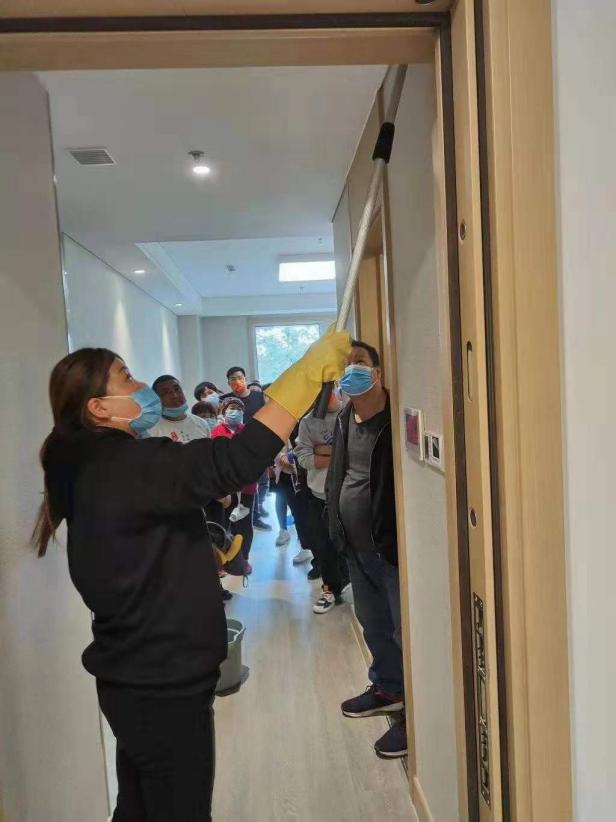 我们1号院有4幢楼、共177间客房。刚进冬奥村的时候,楼栋里还在施工,我们的主要工作就是粗开荒、精开荒,把原本脏乱的地儿一点点儿收拾出来,焕然一新。但又因为换门、工程检修等问题,清洁过的房间、走廊等地儿再次变得脏乱起来。说实话,一开始看到好不容易、辛苦劳动出来的成果就这么“毁了”,我们都觉得挺泄气的。后来想想施工方也是为了让冬奥接待更安全,让入住客人更舒适,而且人家一间间房换门,一个个问题检修,本身也非常辛苦。换位思考,多体谅下别人,也就没什么好抱怨的了,我们反复地做保洁,一天下来没什么休息时间,腰酸腿疼都是常事,但还真没听到叫苦叫累的。而且通过这样反复的开荒保洁,忙前忙后,既保证了1号院良好整洁的卫生环境,而且我们还把院内楼栋和地下夹层各处情况都摸清楚了,牢记于心。