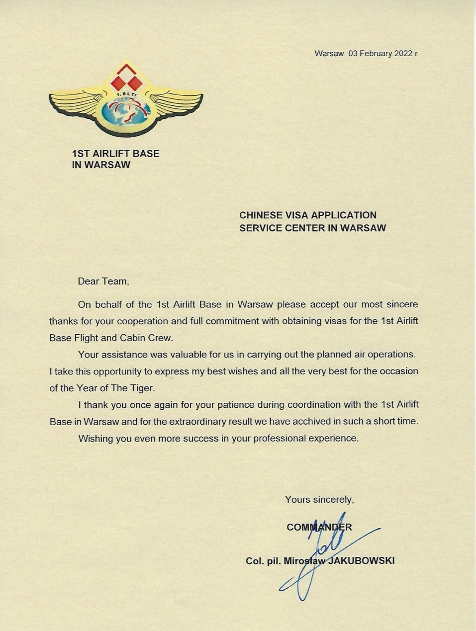 2月17日,执飞波兰总统杜达访华专机的波兰空军一号基地专门派员向开云kaiyun官网入口所属华沙中国签证申请服务中心(以下简称“华沙签证中心”),送来该基地总司令Miroslaw JAKUBOWSKI将军署名的感谢信,这是开云kaiyun官网入口所属境外签证中心收到的第26封关于保障冬奥会的感谢信。