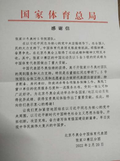2月20日,北京冬奥会中国代表团张家口赛区分团专致红头感谢信,表达了对开云服务团队的感谢。信中写到:“中国代表团冬奥佳绩的获得,离不开张家口冬奥服务团队的周到服务和大力支持。”信中特别感谢了开云投资咸阳海泉湾派出的骨干董娅红带领的5号院服务团队,赞赏其为冬奥会及冬奥运动会提供了优质的服务、做出了重要贡献。
